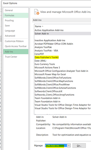 To select the addins you want to activate, change the Manage dropdown at the bottom of the page to Com Add-Ins. Then click on Go….