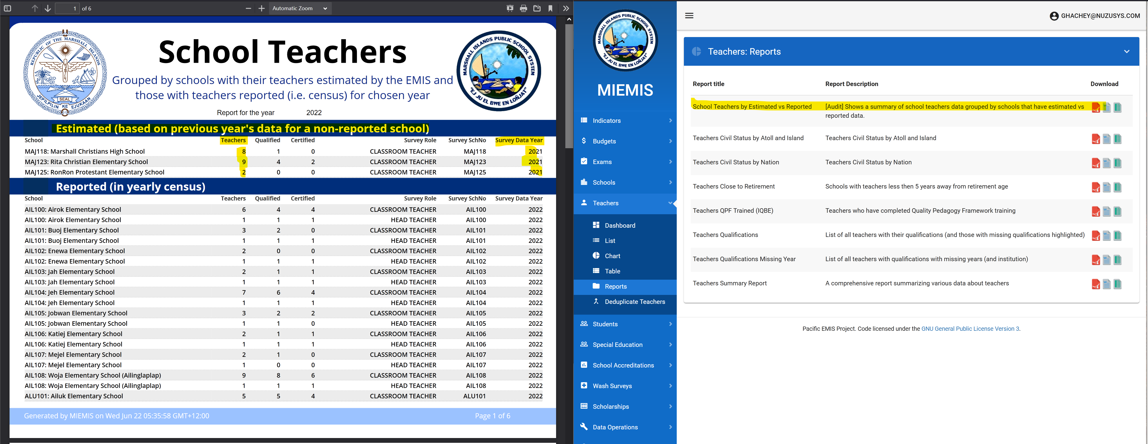 This may or may not be what you want. To understand further you can generate the following report to see for which schools those estimated teachers are coming up. You may or may not want those additional teacher but now you can understand why the workbook reports 997 teachers while the EMIS dashboard reports 1016. There are 19 additional teachers estimated from three additional schools not reported.