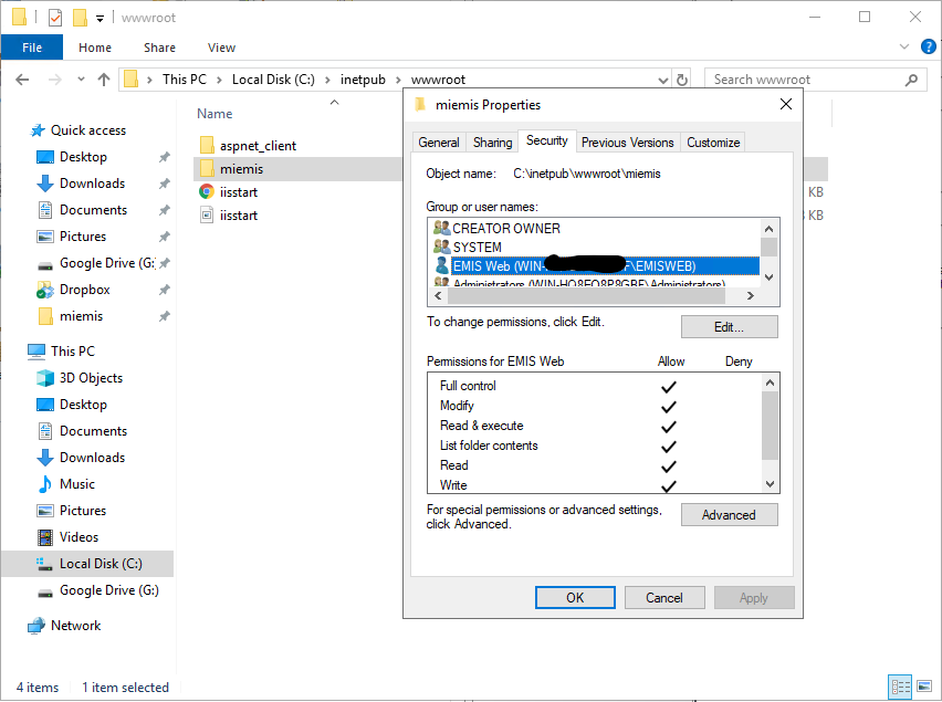 - Make sure that the account running the EMIS apppool has CRUD and Create Folder permissions to this folder