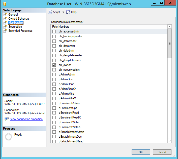 Next assign the db_owner to that new user in Membership as shown below.