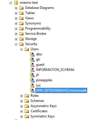 Create a Windows user account (on local machine or active directory) to run the application. Call this new user something like EMISWEB. This new user should both be owner of the SQL database and the one running the IIS web process.