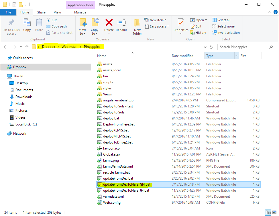 Once the local develop branch is up-to-date. Open the dropbox share which should look like the following image. The script updateFromDev.bat simply copy only the necessary files for deployment into production into the same folder. The extra ones such as the highlighted one updateFromDevToHere_GH.bat is simply a convenience to the developer which likely has a different location for his/her repository. Double clicking that script will sync the local develop branch to the dropbox fairly quickly.