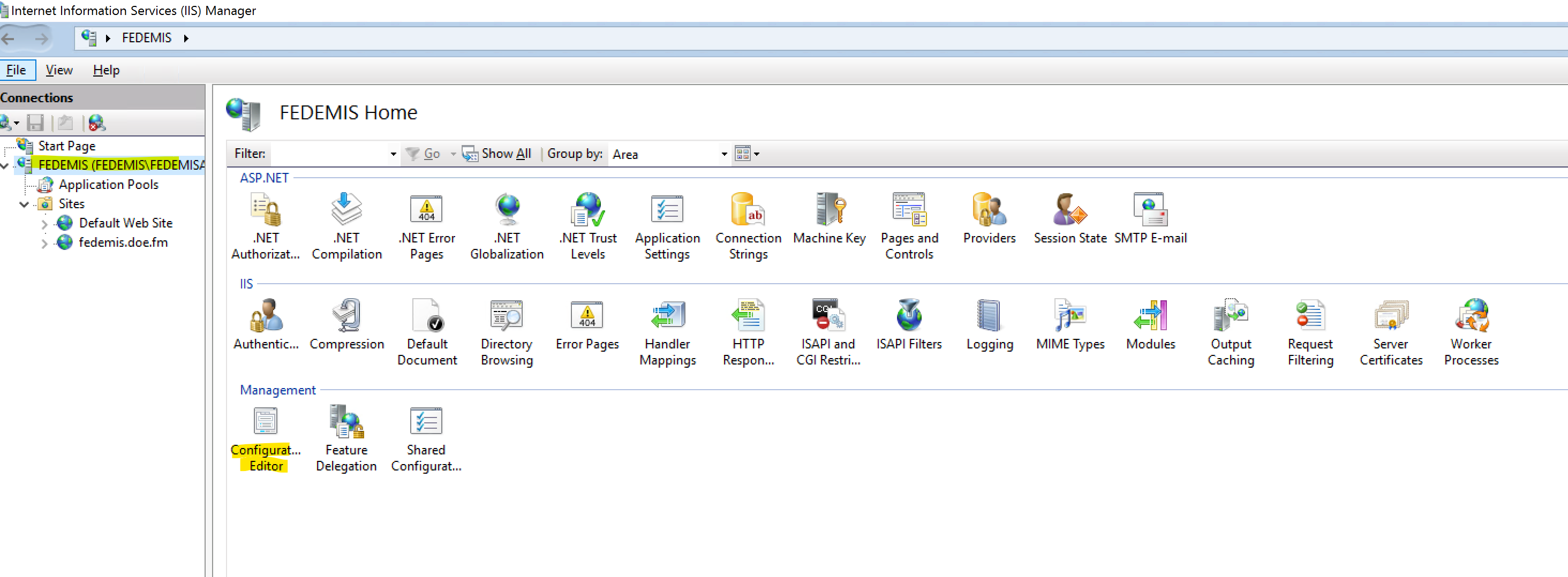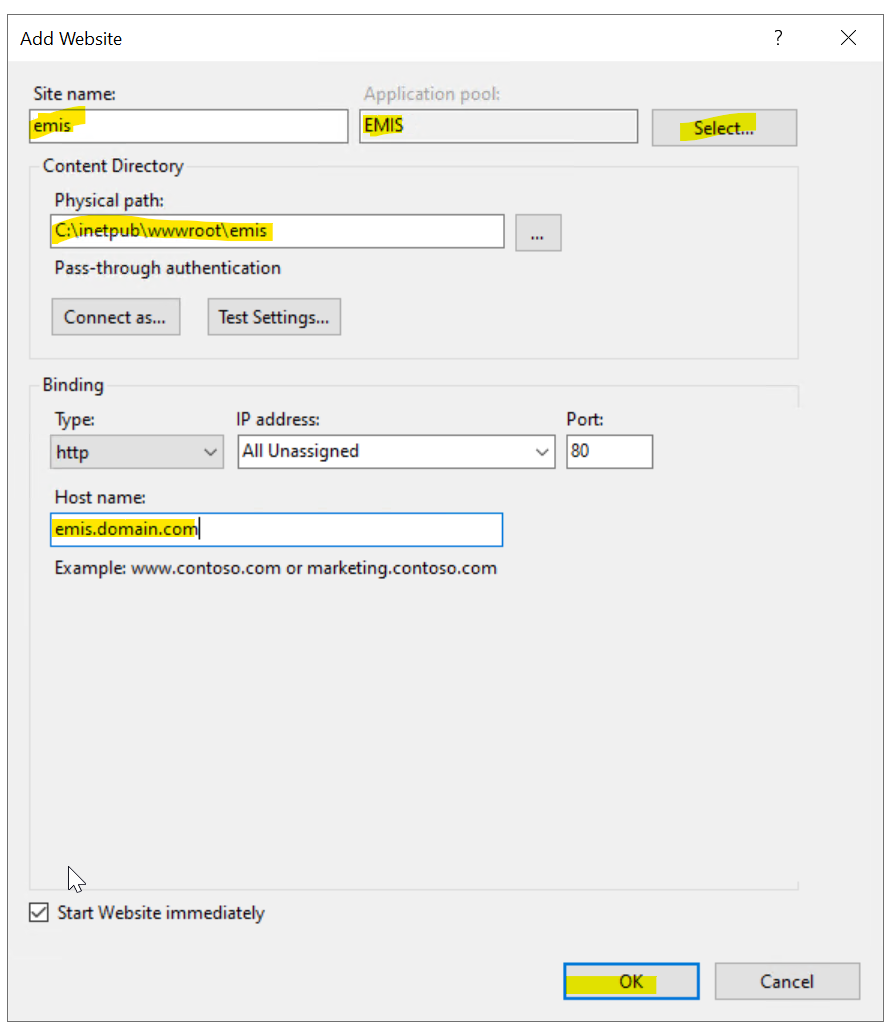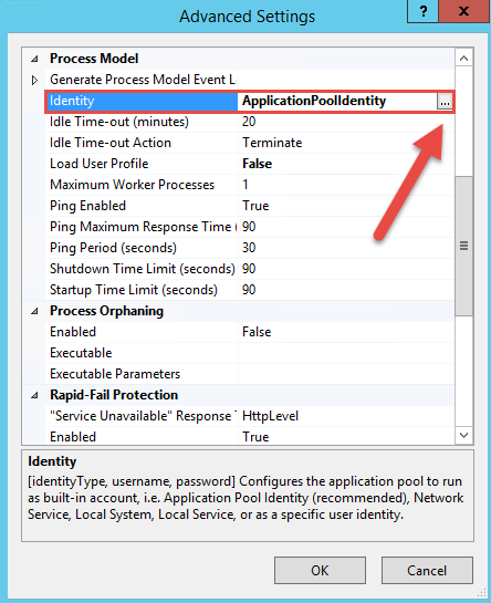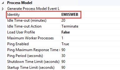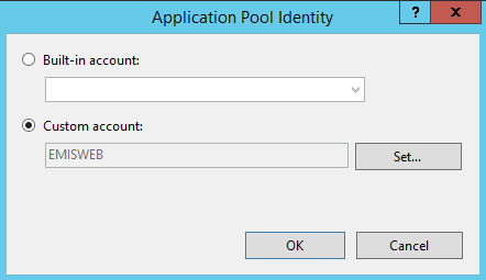 Apart from the default setting as shown in the above figure you will need to go in the new EMIS application pool's Advanced Settings… and configure the Identity to the Windows account EMISWEB we created earlier. Select the EMIS application pool and Advanced Settings…. The steps involved in setting the custom identity are depicted in the following figure.