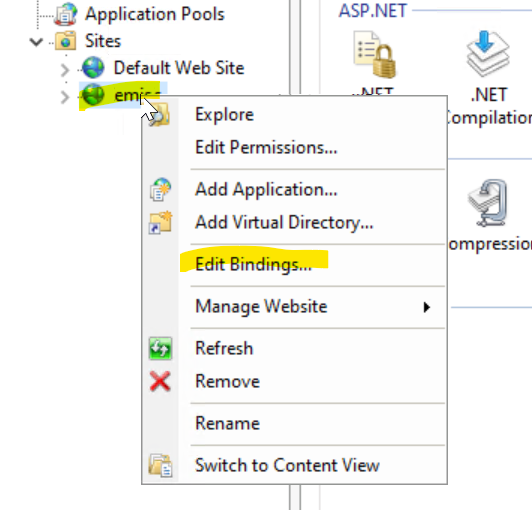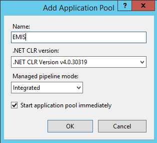 Next open the Internet Information Services (IIS) Manager and right click on Application Pools and Add Application Pool.. to create an application pool called EMIS as shown in figure below. An application pool is essentially an isolated server worker process running that will run our application.