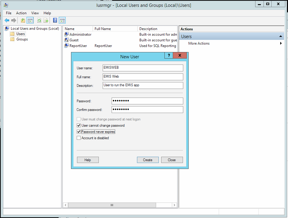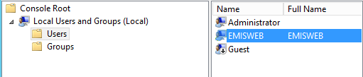 Add the EMISWEB user as db_owner of the databases created previously. You can do this by opening SSMS, browsing to the new database created early on then click Security–Users where you can add a new user as show in the following figure (select Windows user from User Type dropdown list). Locate the Windows account EMISWEB from the User name field and create it.