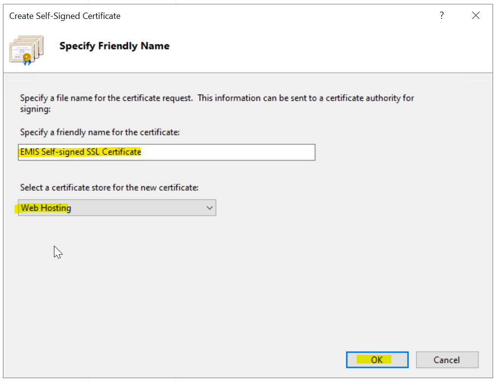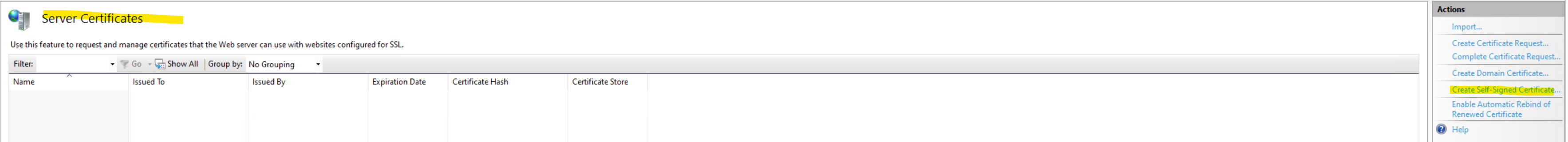 Since this app has a strong security focus it automatically redirects to https from any http connection attempt. Therefore we must add support for https. First create a self signed SSL certificate in the IIS server.