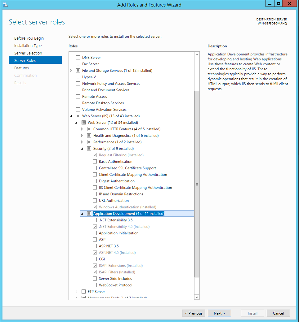To enable to Web Server (IIS) on the Windows Server open the Server Manager and find Add Roles and Features. Find the Web Server (IIS), enable it and make sure it contains the following minimum functionalities.