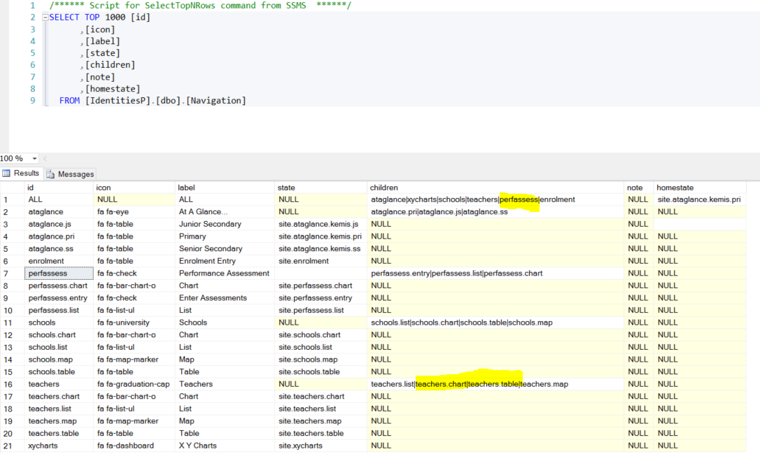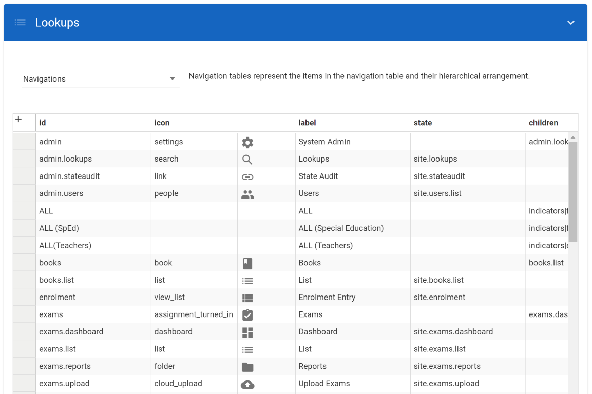 Navigation is essentially how the menu in the user interface is organized. Modules are essential features (e.g. Performance Assessments, Schools, Teachers). Not all Pacific countries will require (or even be ready) for all features of the system. You can in effect enable and disable modules by taking them out of the Navigation menu. The table Navigation in IdentitiesP defines the hierarchy shown in the side bar menu.