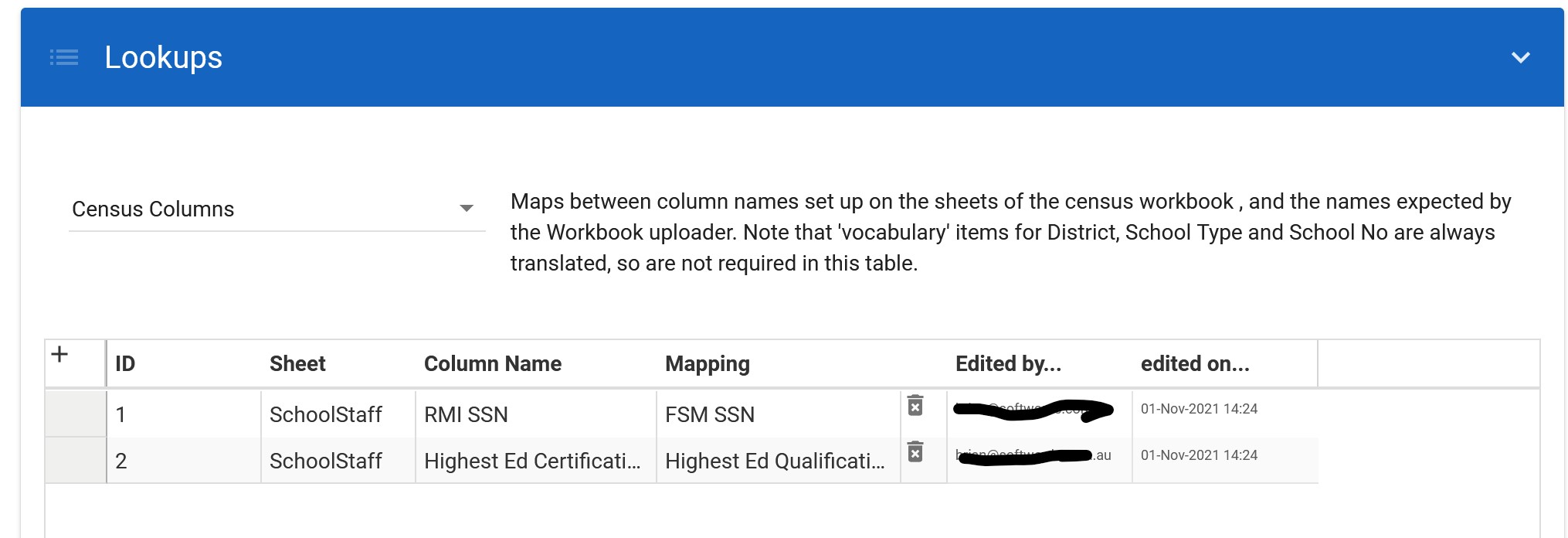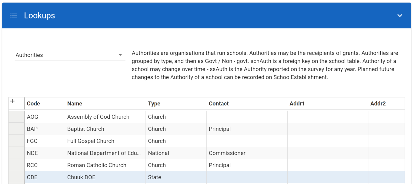Most of the configuration resides in the database; some of which is pre-loaded and most can be edited from the web UI through the Lookups (a small number of which may only be editable directly in the database). Below is an example of configuring a lookup (i.e. the school authorities). You can see a brief description and purpose of the lookup being edited. This is done after the installation.