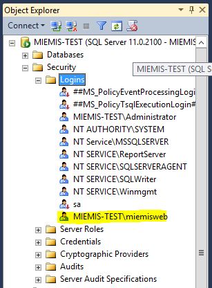 The user created in Create Account to Run the Application must be given permission to login the SQL Server. Do this in the MS SQL Management Studio by adding the user as shown below.