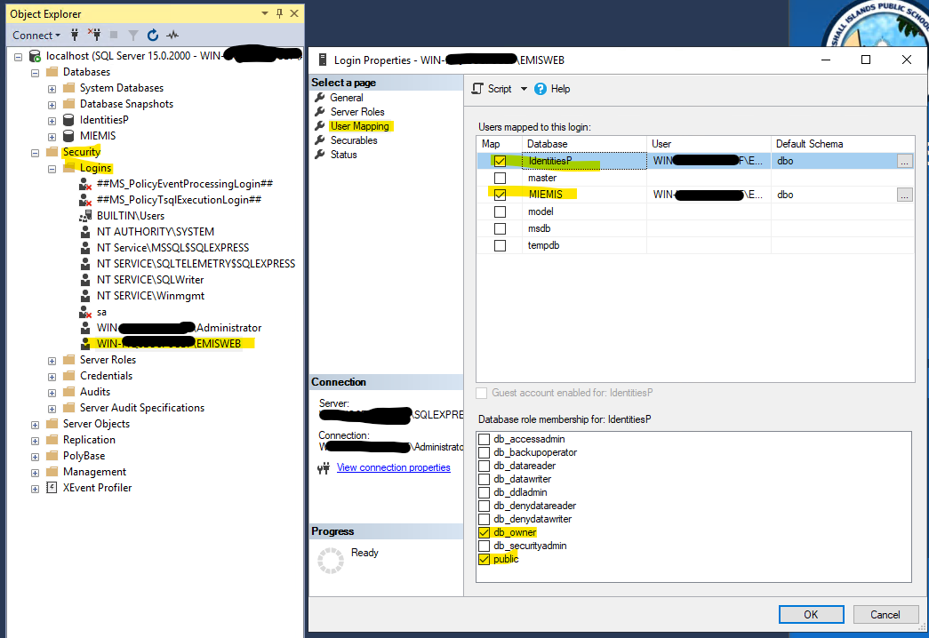 And setup the db_owner mappings to both the IdentitiesP and EMI databases.