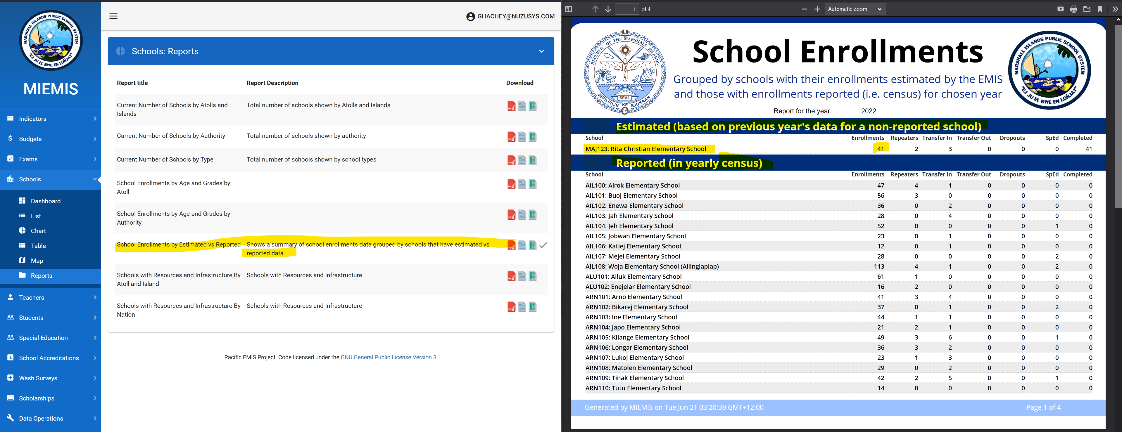 In this case there is a suspicious difference in Private enrollments: 2910 from the source vs. 2951. The first place to check with such minor difference is whether or not there is a missing school in the roster for which the EMIS provided an estimate number of enrollments. For this, we can generated the following report and quickly see that the additional 41 enrollments come from a school with estimated data based on previous years.