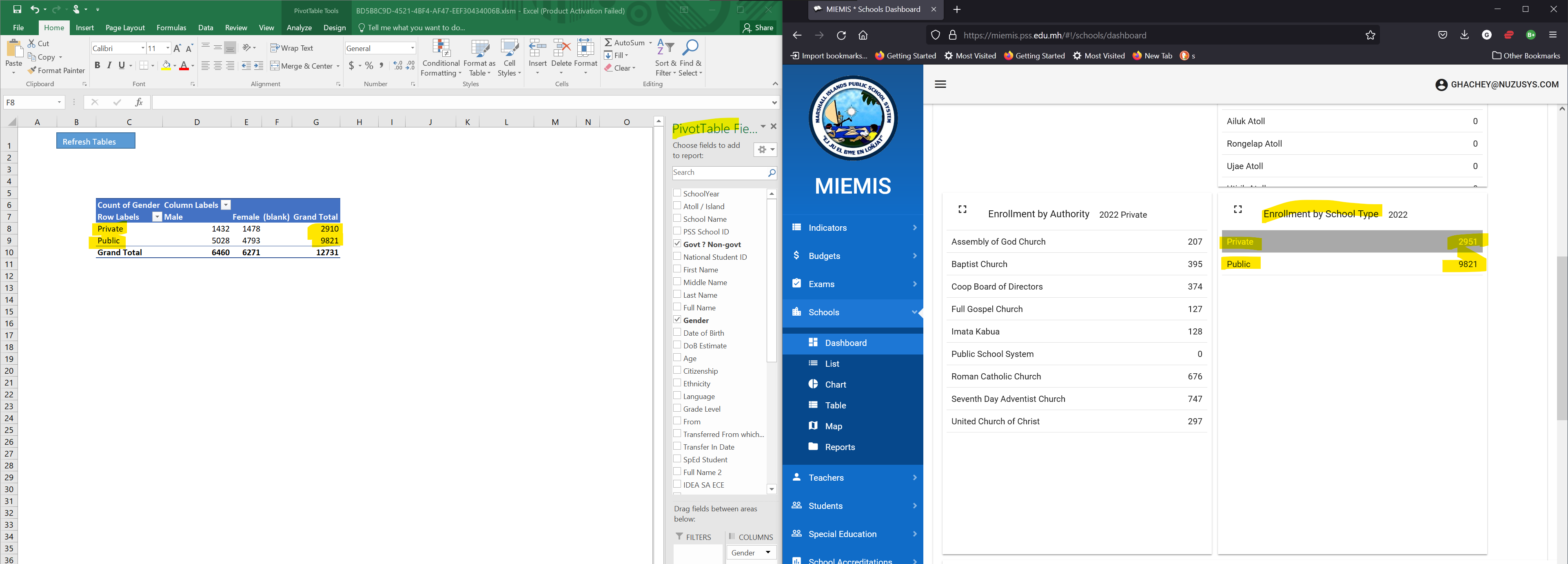 Compare student enrollments from census data source with online dashboard