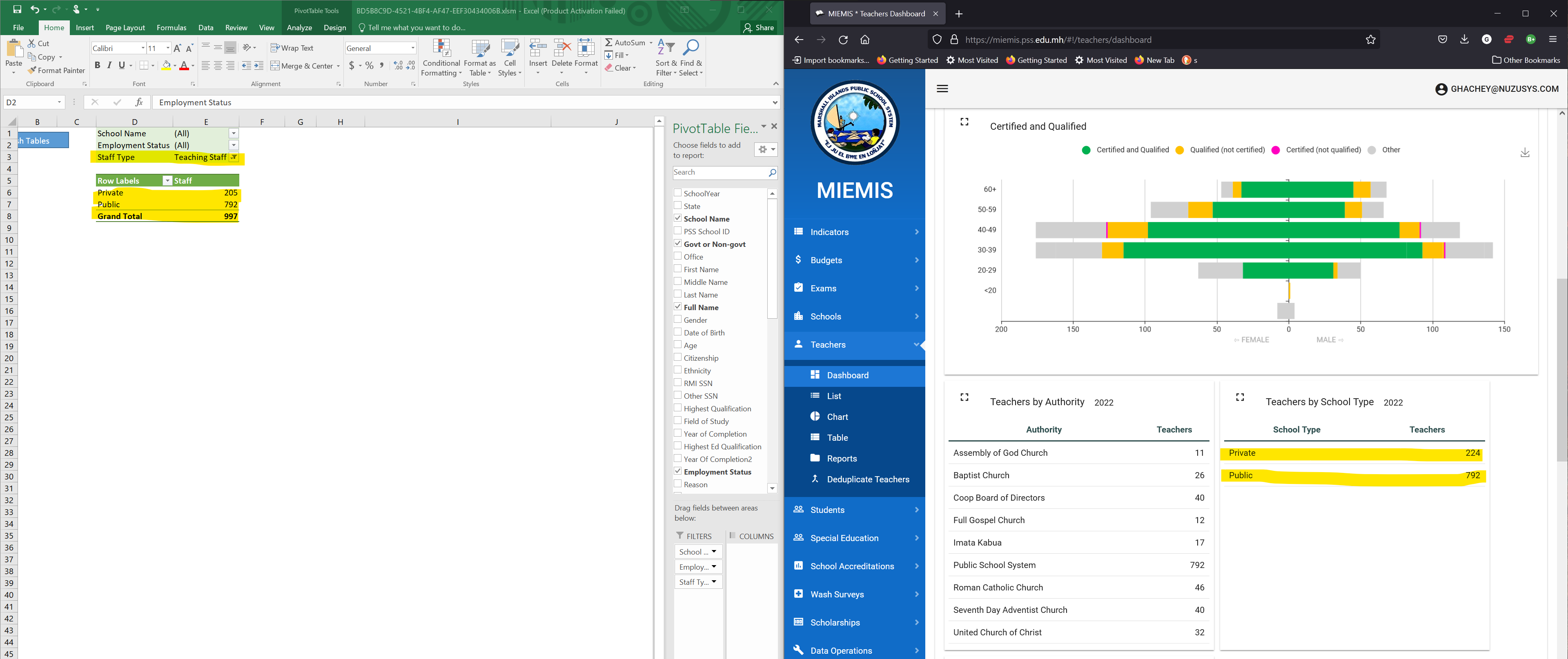 First, do a quick comparison to see you have the total count of teachers as expected. The is a small difference in the number of private teachers. These small differences are usually a missing school in the census that the EMIS expects data for and therefore might provide some estimated values.