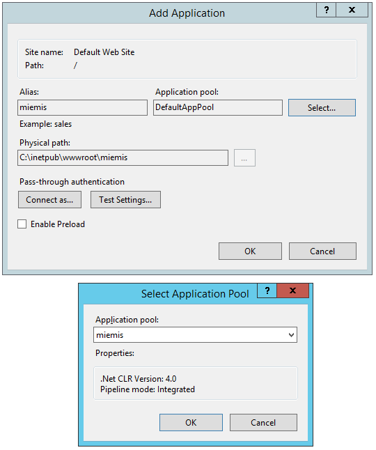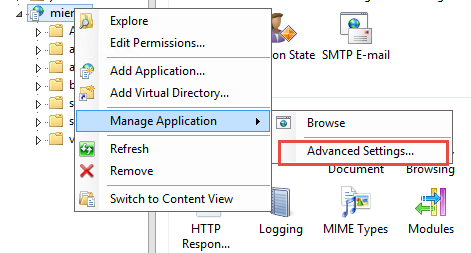 You may have to Stop and Start the application pool for this to take effect. Next, look for your new website in Sites–Default Web Site, in this case it is miemis. Right click it and Convert to Application, something that will look like the following.