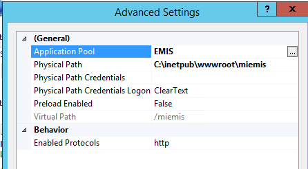 Apart from the default setting as shown in the above figure you will need to go in the new EMIS application pool's Advanced Settings… and configure the Identity to the Windows account EMISWEB we created earlier. Select the EMIS application pool and Advanced Settings…. The steps involved in setting the custom identity are depicted in the following figure.