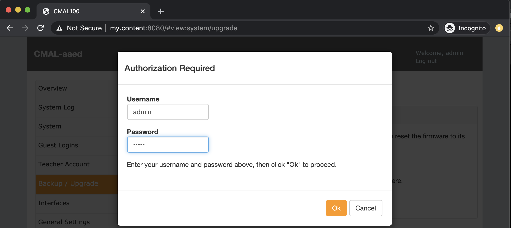 In my case, I was shown the Authorization Required as below. I removed the password and re-entered the default password and clicked on Ok.