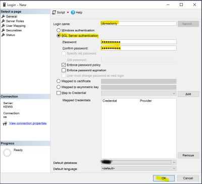 Use the SQL server user password and you can default to database you are creating the read only user for.